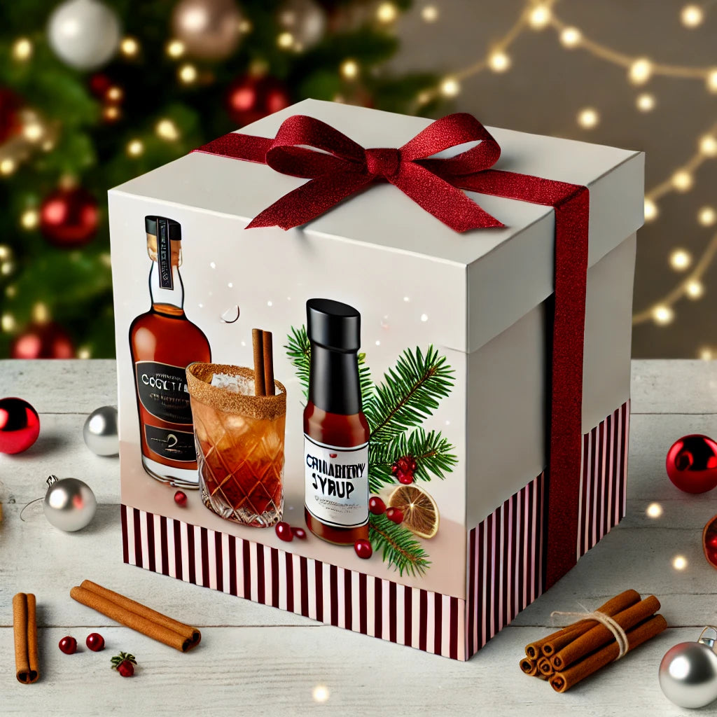 A festive cocktail gift box perfect for Christmas celebrations, includes seasonal garnishes and mixers.