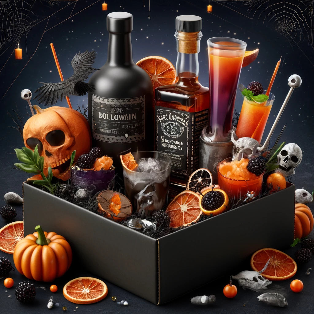 A spooky Halloween-themed cocktail gift box for eerie cocktail parties, includes black and orange-themed items.