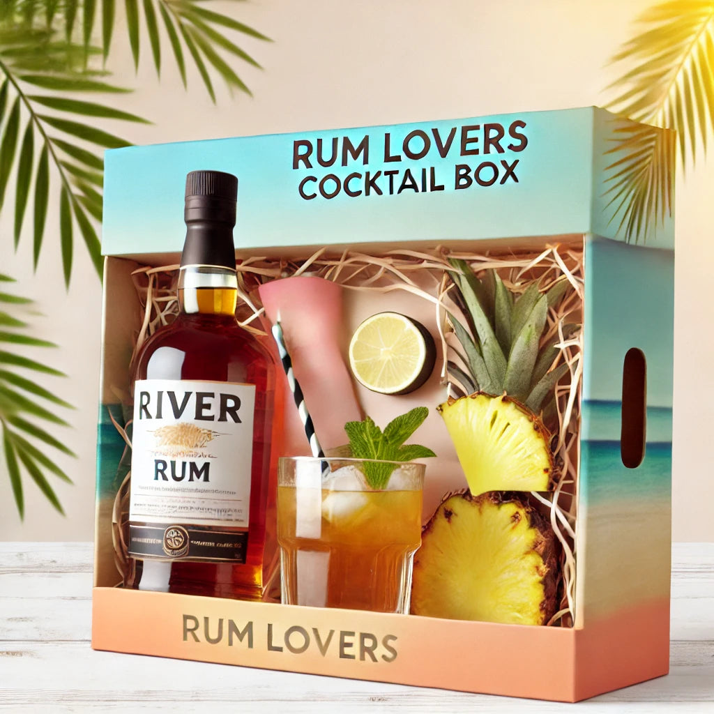 A tropical cocktail gift box for rum lovers, includes rum-based mixers and fruity garnishes.